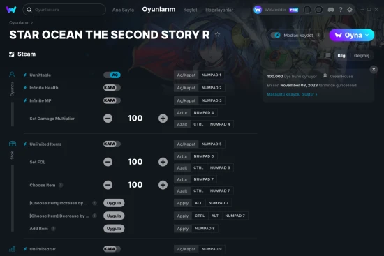 STAR OCEAN THE SECOND STORY R öğreticimizde 23 hile bulunmaktadır ve Steam platformu desteklemektedir. WeMod sayesinde bu oyunda ve çok daha fazlasında hile yap!